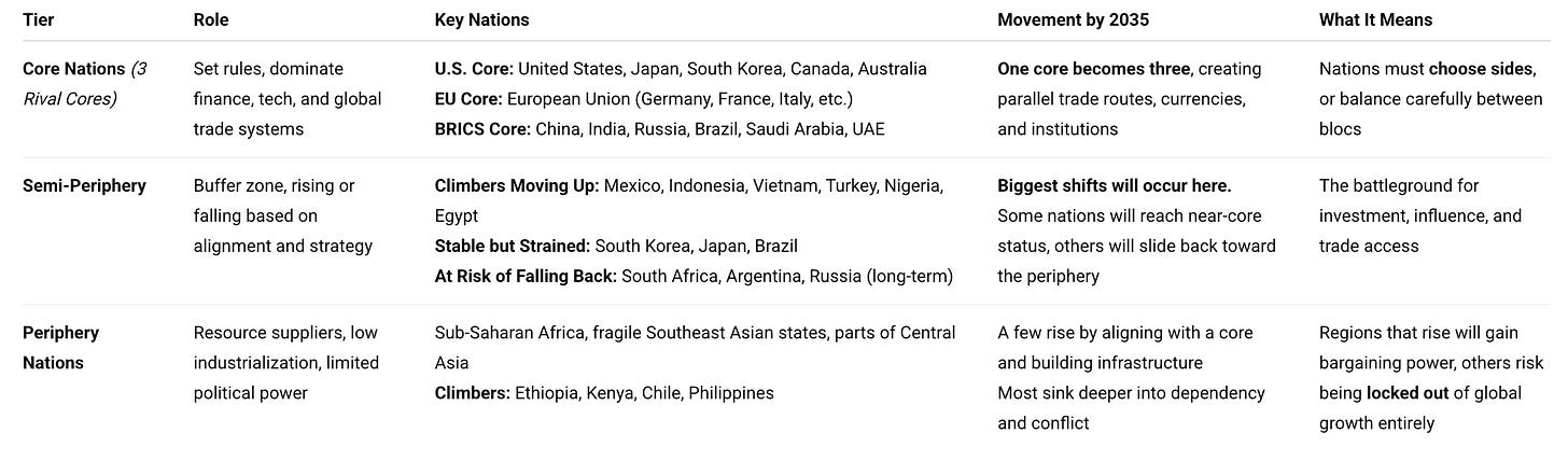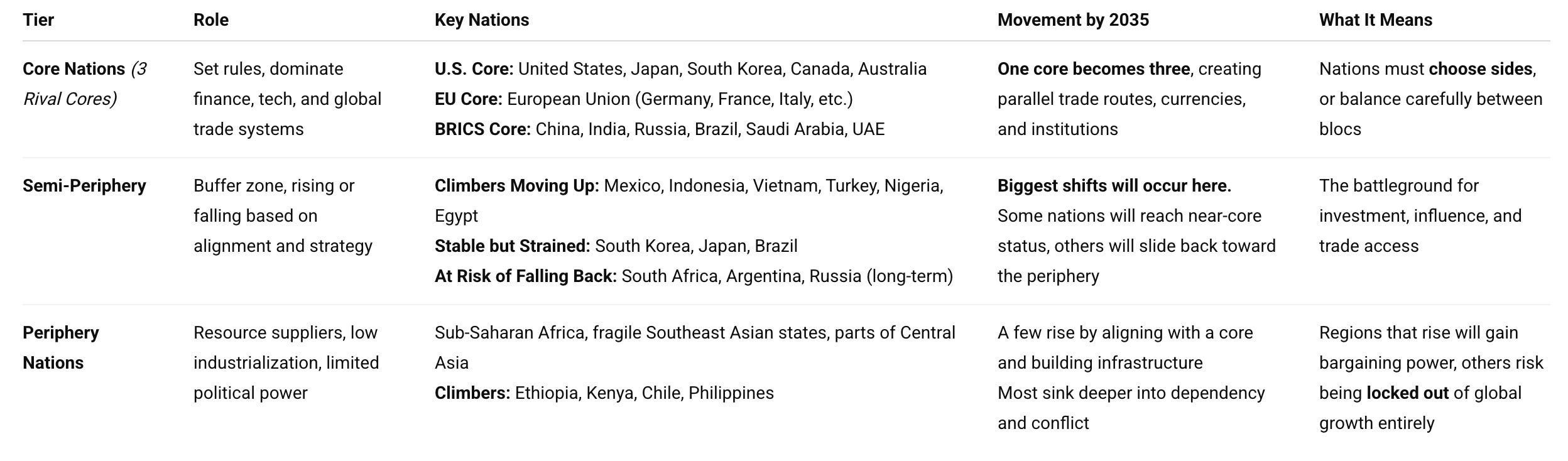 For centuries, global power has been organized into three groups: core nations at the top, periphery nations at the bottom, and a volatile semi-periphery caught in between. The names of the players change, but the structure remains.