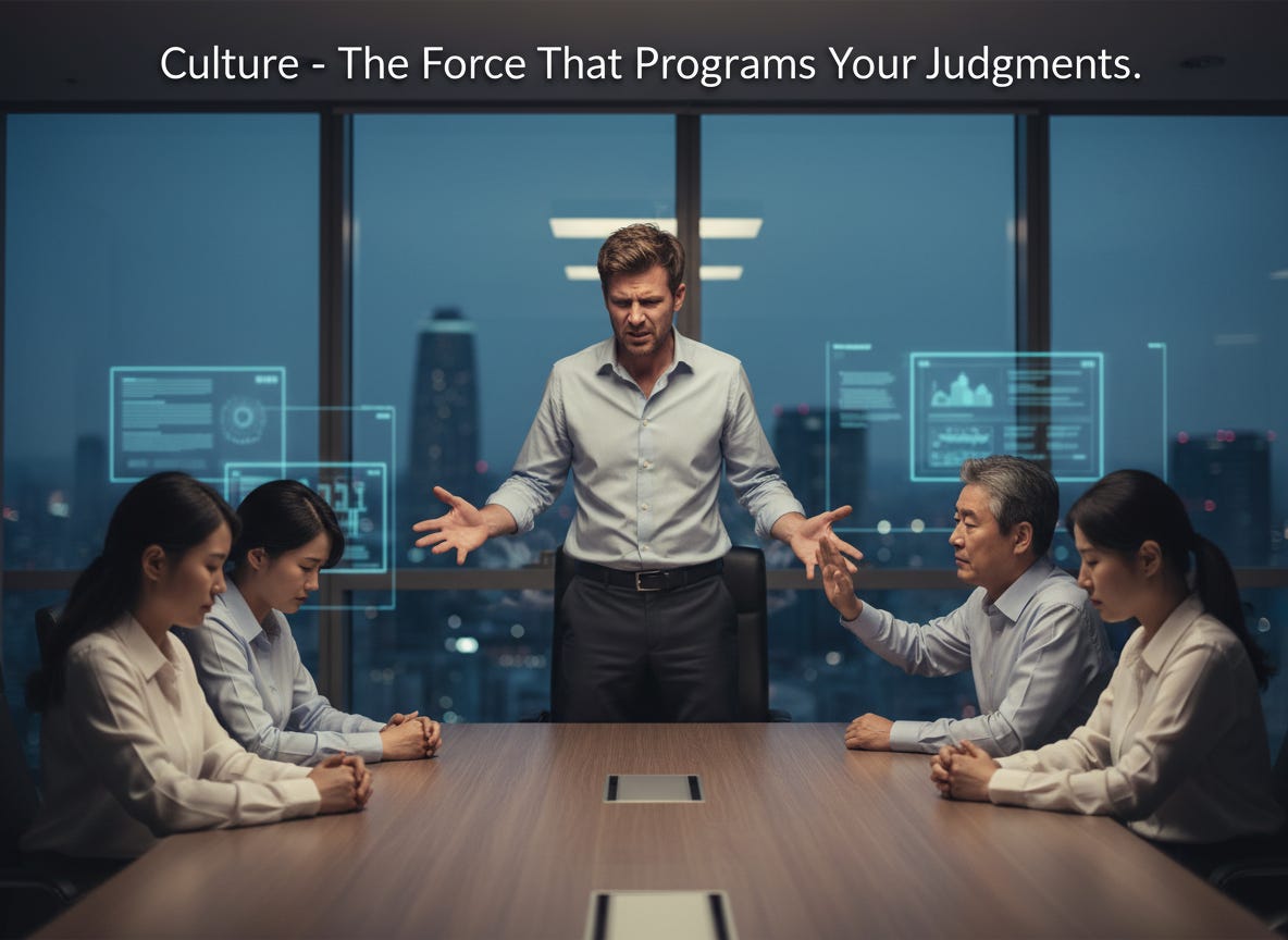 This is what misjudgment looks like from a cultural perspective. It doesn’t feel like bias. The Australian didn’t think “I’m applying my cultural framework to this team.” He thought, “This team has a problem.” The Danish student didn’t think “my host family runs different cultural software.” She thought “they’re being clingy.” The judgment arrives already finished, already certain, and already wrong.