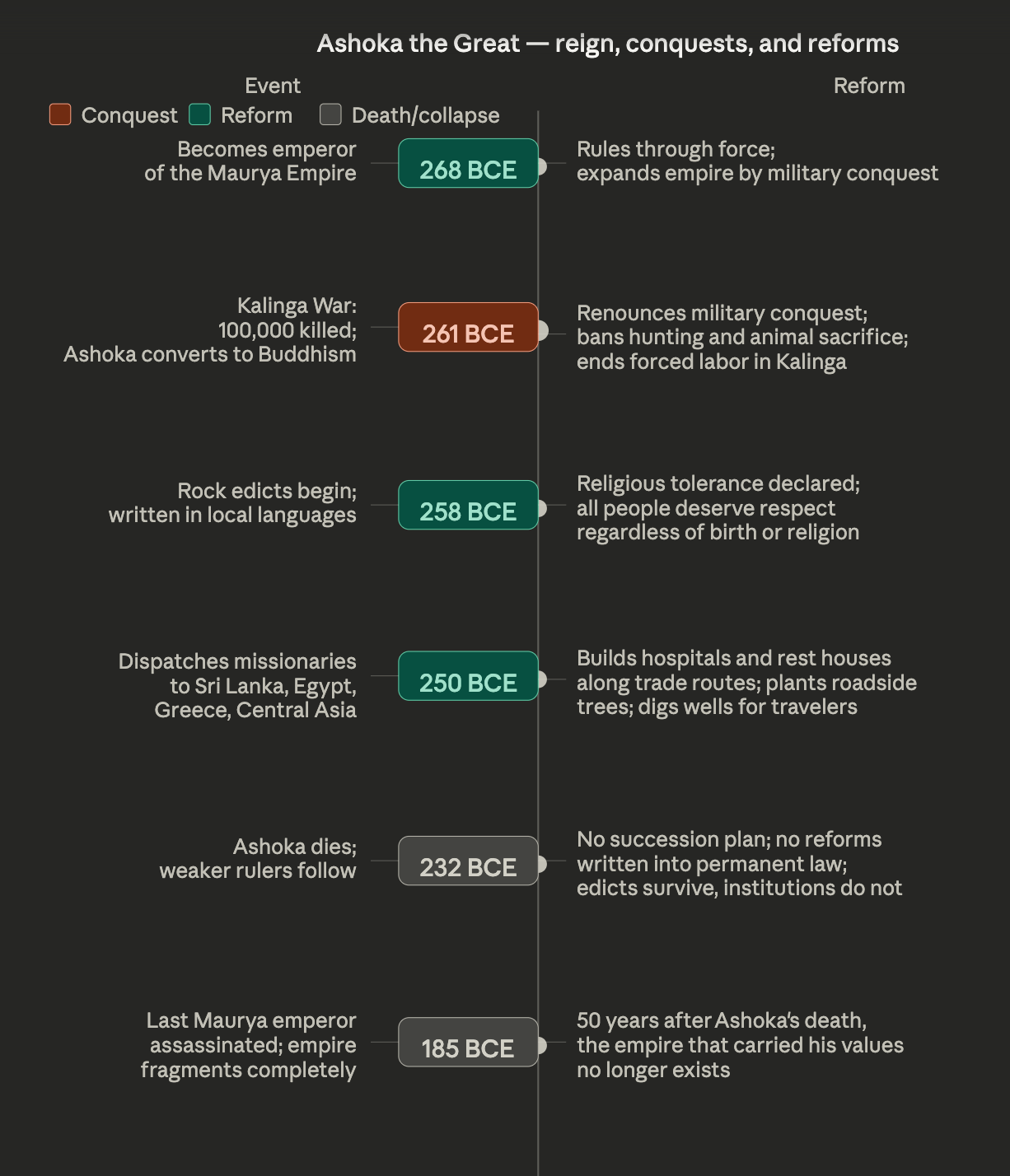 Ashoka Maurya inherited one of the largest empires in the ancient world and spent the first years of his reign expanding it by force. In 261 BCE, he sent his army into the Kalinga kingdom, a coastal state in eastern India that had resisted Maurya control, and watched roughly 100,000 people die. What followed was one of the most documented personal transformations in ancient history. He converted to Buddhism, renounced military conquest, and spent the rest of his reign building hospitals and rest houses along trade routes, establishing animal welfare protections, and proclaiming tolerance and non-harm across religious groups. across an empire that stretched from Afghanistan to southern India.