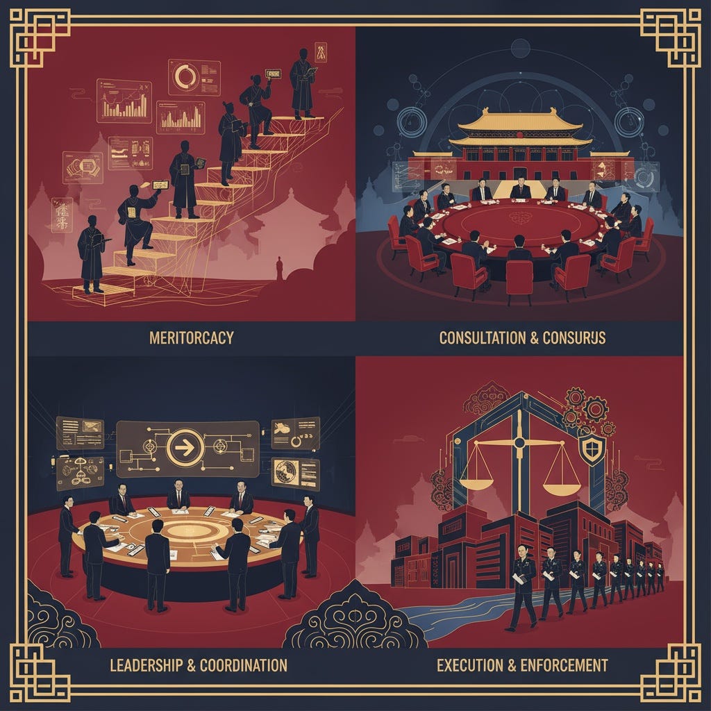 The Chinese system is highly structured, organized to reward competence, maintain order, and achieve long-term goals. It combines ancient ideas of Confucian hierarchy with modern bureaucratic discipline. Leadership is earned through proven results rather than election campaigns. The goal is simple: keep the country stable, efficient, unified, and moving forward.