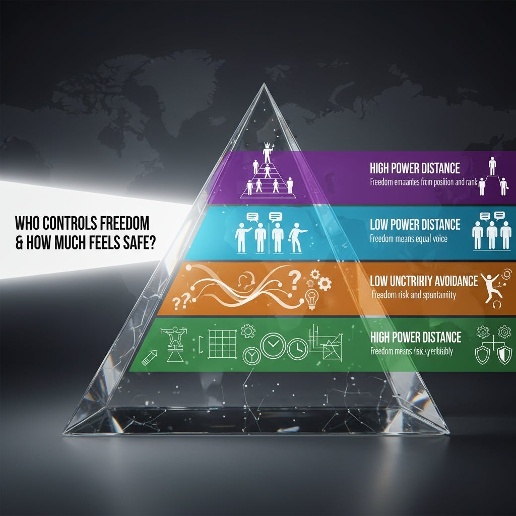 Low Power Distance creates freedom through equality, but also conflict. Meetings take longer because everyone speaks. Protests erupt faster because everyone feels entitled to be heard. High Power Distance creates order and efficiency, but can silence those at the bottom. When freedom flows one way, those below are cautious rather than assertive.