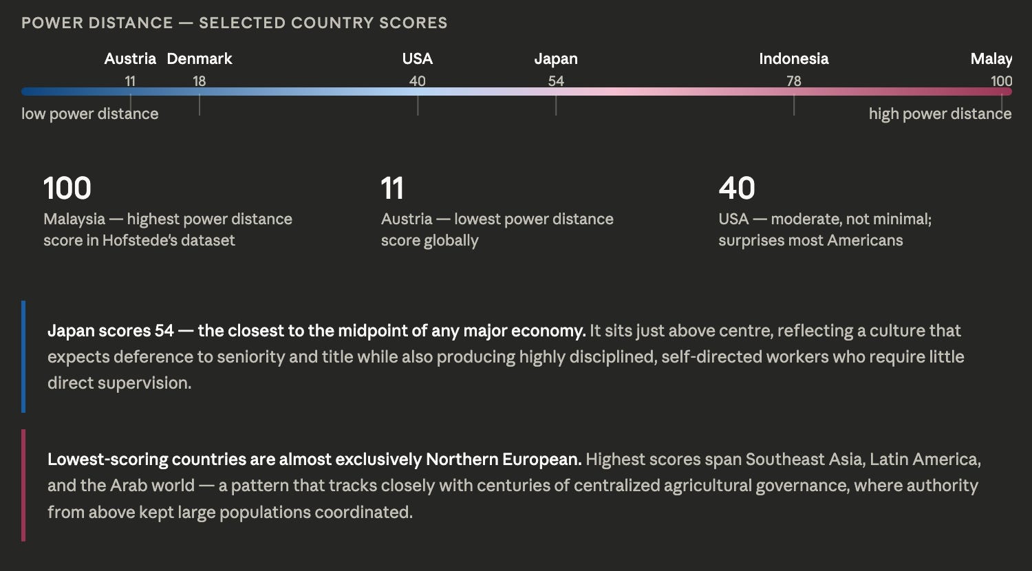 In high power distance cultures, hierarchy isn’t just for organizational function; it carries moral weight. A subordinate who publicly challenges a superior isn’t being direct and helpful; he’s being disrespectful. That disrespect ripples outward through the team and beyond. Malaysia scores 100, the highest of any country Hofstede measured. In Malaysia, the CEO and the janitor don’t just have different jobs; they are on different social and personal levels.