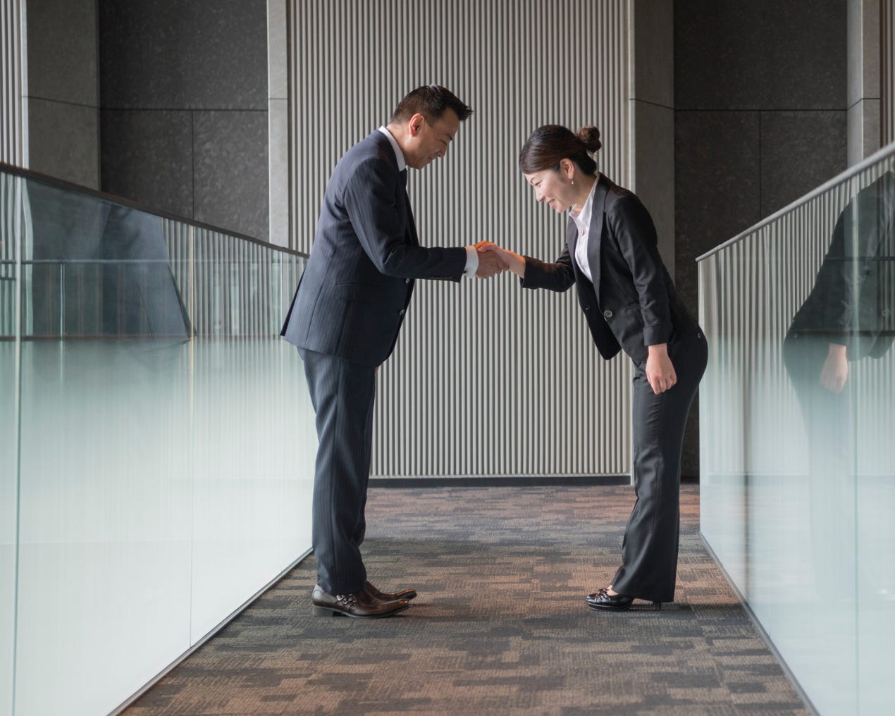 You bow to one another when you meet someone for the first time or a colleague in a formal situation. This is obvious. It shows respect, and it’s just the way we greet each other in these situations.